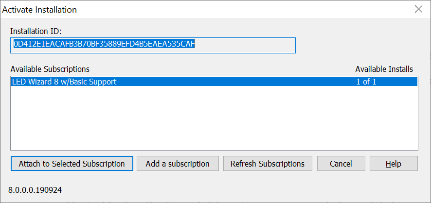 During login, your installation of LED Wizard 8 is checked to see if it's been activated and attached to a valid subscription or trial. If not, you get the following window, where you can pick a subscription to attach this installation to. Select one of the subscriptions listed and press Attach to Selected Subscription. Normally there is just one subscription listed. A subscription can have multiple "seats", so that a single subscription with, for example, five seats, lets you install LED Wizard 8 onto five different PCs. When you install LED Wizard 8 onto a PC and activate it, you reduce the available installs by one.