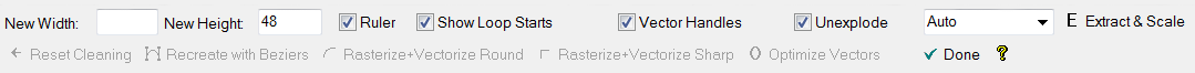 In the property bar, to use the Unexplode tool, check the box and also select Auto or an "Unexplode Tolerance" from the drop down list. This value refers to the distance that the software will look for another vector to connect. In some cases, the points will be right on top of each other, but in other cases, the points may be a small distance apart. Note that if you are Scaling the artwork, then it will be scaled prior to running the Unexplode feature. If you aren't sure what value to use, then Auto is the safest bet. Extract & ScaleOnce you have selected the objects you want to keep, have entered a New Width or New Height, and checked Unexplode if required, you are ready to click on the Extract & Scale button. This will scale the selected objects and run the Unexplode routine if selected. But please note you are still in the tool at this point. Extract & Scale is an intermediate step; there is more to do! You can adjust the Width or Height or the Unexplode settings and click on Extract & Scale again. After you click on Extract & Scale, you now see the objects you've selected, and if you have Vector Handles checked, you will see all the vectors and nodes of the artwork. This display option is to help determine the next step, which is to use one of the automated data clean up tools, if necessary. The second line in the property bar contains the options for data clean up. These tools are "global" tools in the sense that they work on the entire artwork in one operation. This is different from vector editing tools, such as those found in the vector editing pop up menu or ALT Smoothing (add link). Recreate with Bezier CurvesThe first tool to consider is Recreate with Bezier Curves, which will convert the artwork to Bezier curves. If the original artwork is in arcs and lines, or especially just lines (chords), then this function will reduce the number of nodes considerably. If the artwork is already in Bezier curves, which is common in files that were designed in Adobe Illustrator or Corel Draw, then the effect may be minimal.