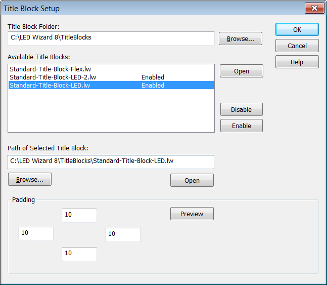 When you save a new or edited title block template file into the TitleBlocks folder, it will show up here. You can Enable or Disable individual title block files, as well as set the Padding