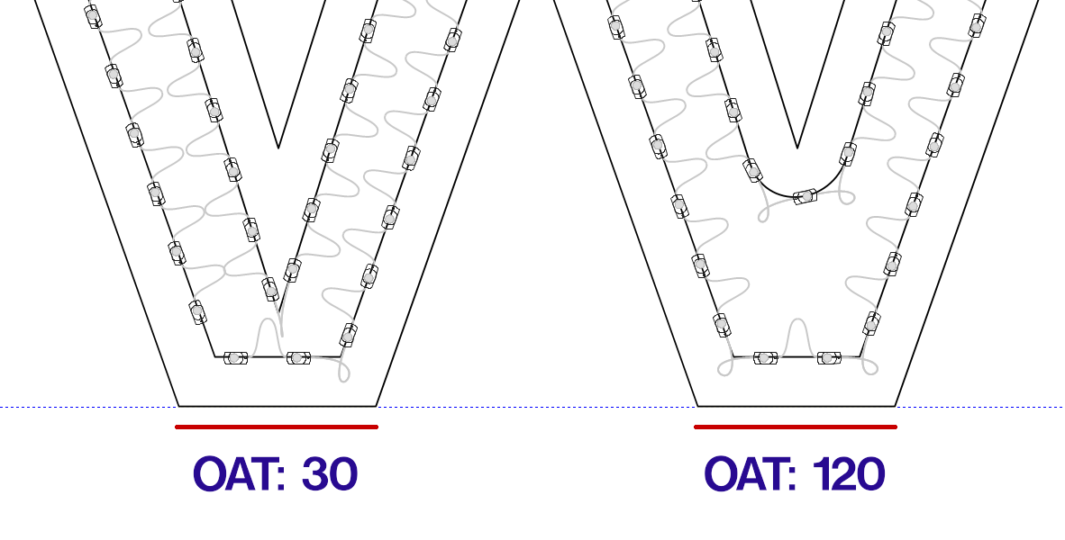 Imagine a line down the middle of the stroke, dividing the stroke into two 5" sections. We then have two runs, evenly distributed in each section.