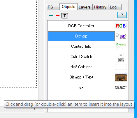 This tool can be used to store common shapes and sign cabinets that are commonly used, in addition to bitmaps, logos, contact info, legal statements, warnings, etc. Experiment with adding Objects that you commonly use in layouts, as you may be able to save valuable time.