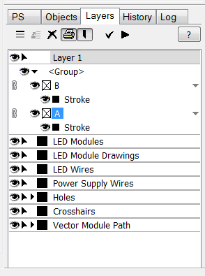 The Layers Tab shows all the layers in your layout in an easy to view, heirarchical tab. Layering allows objects to be controlled in the following ways: