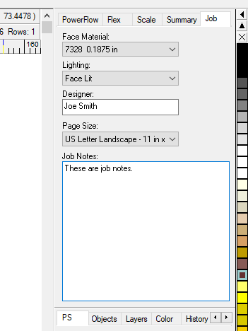 Select the face material for this job. This can be automatically placed into the title block with the $FACE_MATERIAL variable. See Edit Face Materials to enter new face materials to show up here in the Job Tab.