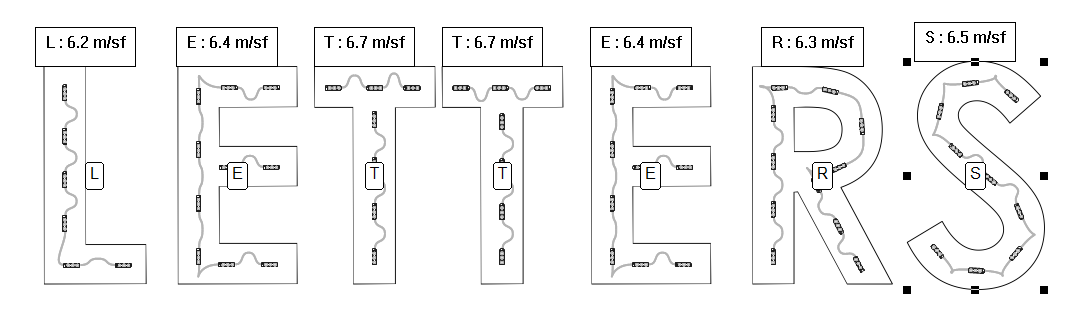Simply select an object or group letters, select the Assign Letters command in the LED menu, and then type each letter in sequence. It will automatically move to the next letter as you type, and the current letter is highlighted with control handles.
