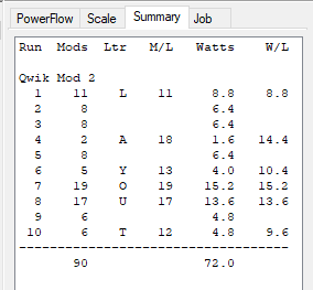 The columns are Run (run number), Mods (module count for the run), Ltr (letter), M/L (modules per letter), Watts (watts for the run), and **W/L" (watts per letter).
