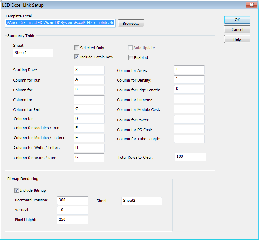 This is the path of the XLS file that will be used as the template file. You can create a template with cells reserved for the LED data, plus any other data you would use. This file can be a starting point that you customize, or you can start with your own file.
