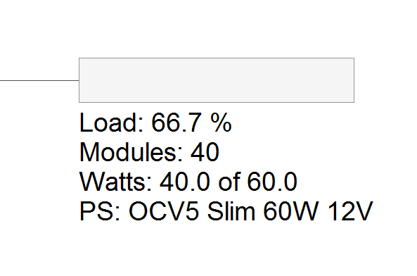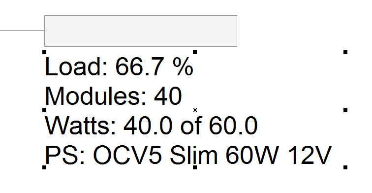 Please note that you can scale this power supply info by clicking on the text and then using the upper right control point. On larger layouts with many power supplies, sometimes this data can appear too small. The retangular box is the the actual size of the power supply and cannot be scaled.