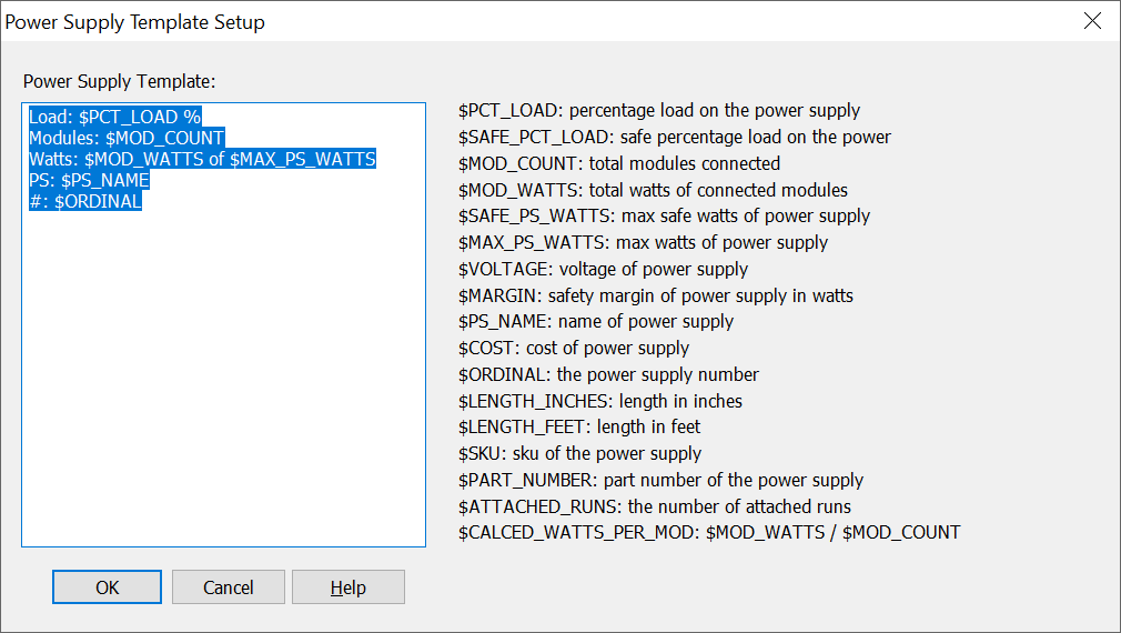 This dialog box lets you customize the power supply info text that appears beneath each power supply in your layouts.