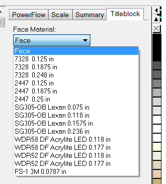 The Job Tab has a drop down list of the face materials that you entered and can choose from for the current job.