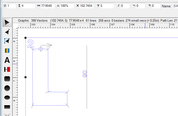 The numbers along the bottom edge of the plot are the radii of the arcs. These numbers can be used to select the best notching tool for each arc (i.e. smaller notch angle for shorter radii and larger notch angle for longer radii).