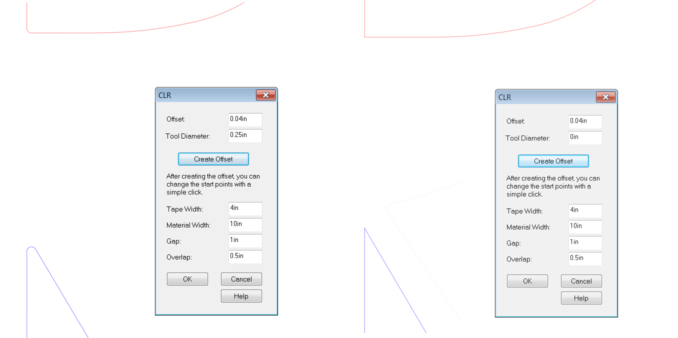 This number tells the software how much to compensate for the tool diameter on all left-hand turns in the cutting path, where the tool's diameter prevents sharp corners from being created. Enter the diameter of your router bit in this box. If you are cutting your bakcs with a laser, then you can enter 0 here. The image below shows what this option does: