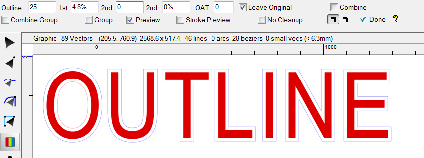 Inlining, outlining and offsetting can be done in the outline mode or in the color mode. It is easier to distinguish the character from the outline in the color mode.