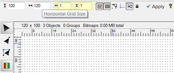 You can then enter the increments for both the Horizontal and Vertical axis. Once you select OK, the grid will be displayed with the new information. You can also select Snap to Grid, which will only allow you to move an object from one grid point to the other. When you use Grid Mode as an LED layout option, this will create a grid with the horizontal and vertical axes that you define. Show GuidelinesWhen the Show Guidelines command is selected, the guidelines are hidden or shown, depending on whether the command was checked or not. If it was previously checked, then the guidelines will be hidden, and if it was not checked, the guidelines will be shown. The guidelines are always active whether or not they are shown. Show RulersThis option will show or hide the Rulers on the top and left side of the workspace window. Note that you must have the rulers on to create guidelines. Rulers will be displayed in the Units of Measure that you have selected in the Options dialog box in the Tools Menu. Show Loop DirectionThe Show Loop Direction command is a toggle command, meaning that when you select this command, the loop direction will be displayed if it isn't already, or it will be turn off if it is displayed. See Reorder Loops for more information. The Show Loop Direction option should normally be checked. Show Job Color PaletteSelect this to show or hide the palette at the bottom of the window that contains the current job colors and lets you set fill color, stroke color and stroke width parameters.