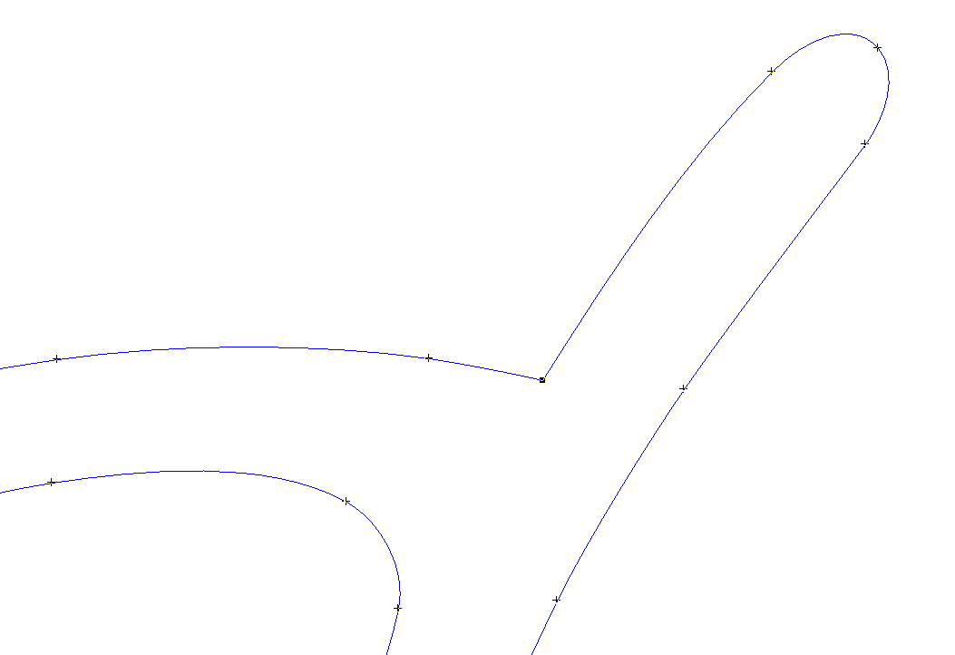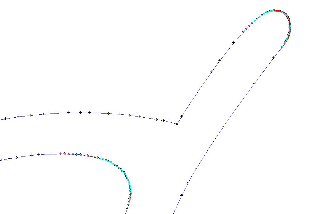 In this example, you can see some points highlighted as blue, which are non-tangent very small vectors, and some points highlighted in red, which are tangent very small vectors. Depending on various parameters of an imported file, sometimes there are "very small vectors" that should be edited out using one of our tools. The Data Clean Up Tool is the obvious first choice, but the Alt-Smoothing function (Vector Edit Tool) is also very effective at removing extra points and smoothing out the data. Using the function Recreate with Bezier Curves (Tight) (available in the Data Clean Up Tool or standalone in the LED Menu), we get the following: