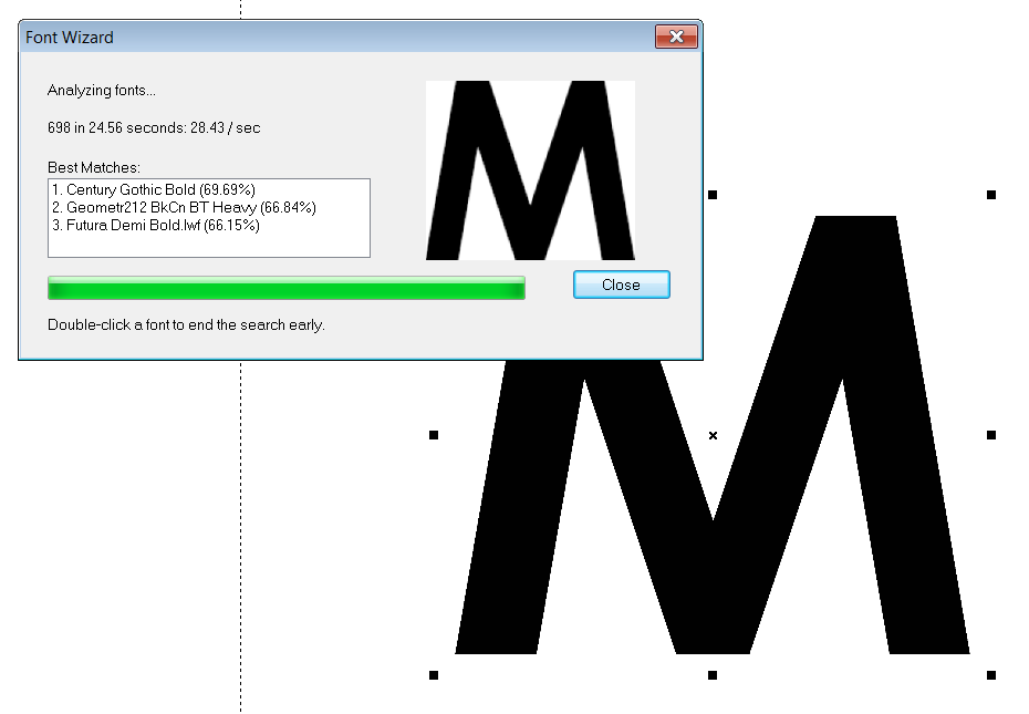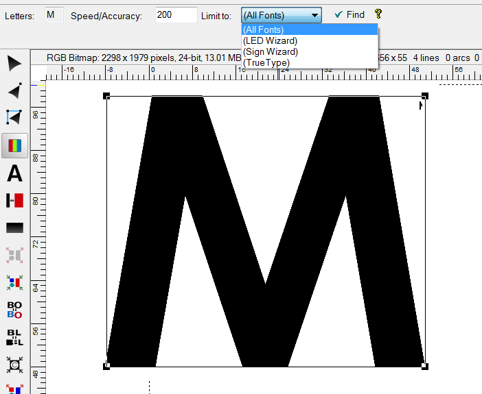 Font WizardThe Font Wizard provides a simple way to determine the best font match of a scanned letter set or imported bitmap file. Once this font is determined from the fonts on your system, you can then type over the bitmap with the standard Text Tool. The steps for using this feature are: