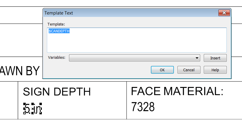 The actual Face Material used for the job should be chosen from the list in the Job tab in the upper right of the screen, and then the data variables will follow from the selection. $FONT $ILLUMINATION $LETTER_HEIGHT $MODULE_COUNT_AND_NAMES $MODULE_BRAND $MODULE_COUNT_AND_NAMES $MODULE_COUNT_AND_PART_NUMBERS $BRAND_NAME $MODULE_COUNT_AND_PART_NUMBERS Adding the brand name to the beginning gives us this: $MODULE_BRAND $MODULE_COUNT_AND_NAMES - $MODULE_PART_NUMBER $PS_COUNT_AND_NAMES $PS_BRAND $PS_COUNT_AND_NAMES $PS_COUNT_AND_PART_NUMBERS $PS_BRAND $PS_COUNT_AND_PART_NUMBERS $PS_COUNT_AND_NAMES ($PS_PART_NUMBER) $PS_BRAND $PS_COUNT_AND_NAMES ($PS_PART_NUMBER) $MODULE_NAME $TOTAL_MODULE_COUNT $TOTAL_WATTS $PS_NAME $TOTAL_PS $TOTAL_AREA_SQ_FEET or $TOTAL_AREA_SQ_METERS The total area of the sign can be displayed as square feet or square meters. This is useful for face and back materials, but note that the layout is not nested. $TOTAL_PERIMETER_FEET or $TOTAL_PERIMETER_METERS The perimeter measurement, in feet or meters, can be used to estimate trim cap and channel letter return coil. $TOTAL_FOOTAGE The Total Footage data variable should only be used with fixed spacing modules! In general, the concept of "footage" is problematic with LEDs that have variable spacing, so be careful. $DATE_US This is the standard US date formatting, which returns the current date in the MMM DD, YYYY format, such as Jan 01, 2019. $DATE_INTL $DATE This returns the current date in this format as the default: Jan 01, 2019. You can change the Date formatting in the Options dialog box, General tab. In some cases on these data variables, you may want to add a label after the data is updated. To do this, enter the label after the data variable with a space in between. In other cases, a label is already added, such as a unit of measure. For example, after $MODULE_COUNT you may want to add text such as "modules" or "mods" So you would enter "$MODULE_COUNT modules", or "$MODULE_COUNT mods" and get: 180 modules 180 mods Just entering $MODULE_COUNT would give: 180 Please note that to edit a Variable Text Object, double click on it while in the layout Tool to bring up the Template Text dialog box.