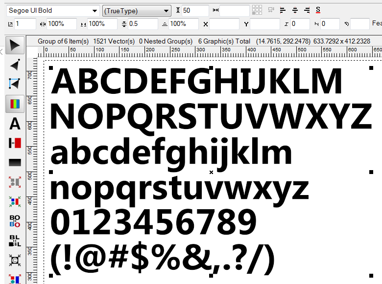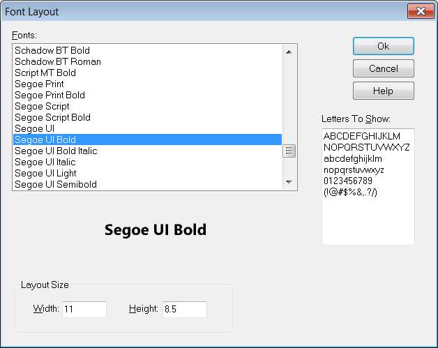 Font LayoutThis window lets you create a layout of an entire font quickly and easily. Select the font and optionally the set of letters to include and press OK.
