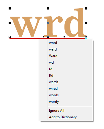 AnchorThis box lets you select where the anchor point is for the text object. This is useful when specifying the X,Y position numerically. AlignThese buttons will align a group of text objects, as well as align individual text objects so that, for example, when you type the text will expand to the right or from the center. Live Spell CheckingThis button enables or disables the Live Spell Check feature. ScaleUse this to enter a relative scale factor to apply. Letter SpacingThis controls the spacing between letters, also called kerning. Word SpacingThis controls the spacing between words. Line SpacingThis controls the spacing between lines when text objects are grouped, or when entering a new line of text. Extend/CondenseThis controls how scaled the letters are horizontally. Horizontal Position of the Anchor - XThis is the horizontal position in the layout as a number. Vertical Position of the Anchor - YThis is the vertical position in the layout as a number. Slant / ItalicThis is the italic or slant of the letters, in degrees. SkewThis is like Italic but applied vertically. RotationThis is angle of rotation in degrees. Kerning TextTo change the spacing between letters in a text object (kerning), click and drag the small handles at the lower left corner of every letter. To change the spacing all letters at once (tracking), click and drag the lower left or lower right handle of the text object. Break ApartThe Break Apart command will break up a line of text into individual characters. This can be a handy feature if you wish to increase the size of one character without effecting the rest of the line. You can re-group the characters and select Convert to Text, and this will turn the individual characters back into a line of text. Live Spell CheckingThis command will toggle the live spell checking mode. In this mode, a red underline indicates a misspelled word, and you can Ctrl+Right Click on the text to see a list of options to take. For example: